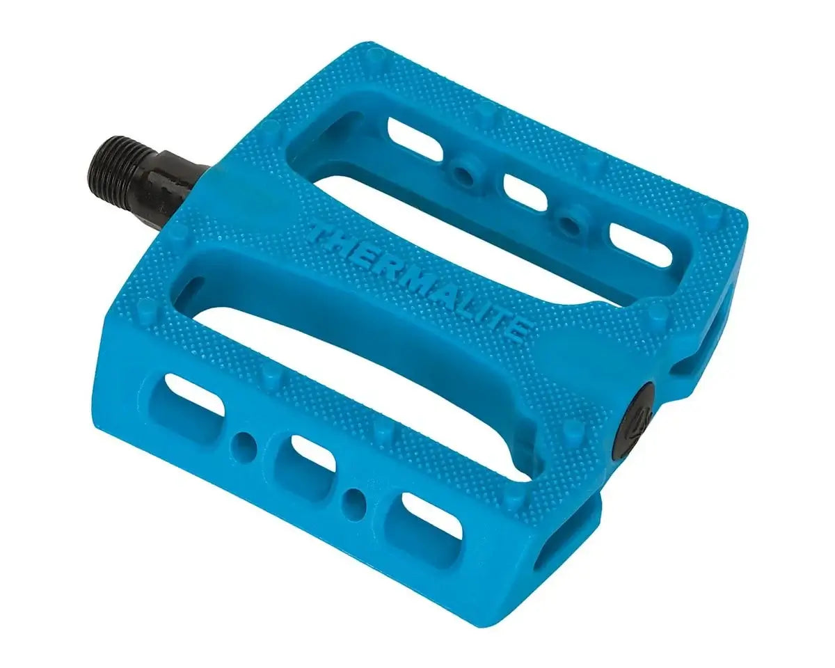 The Stolen Thermalite pedals are made from Stolen's proprietary Thermalite material with a slightly concaved micro knurled body, 12 molded pins per side for maximum traction, recessed end cap avoids damage from drops and chromoly spindle with unsealed bearings. 9/16" (14 oz)